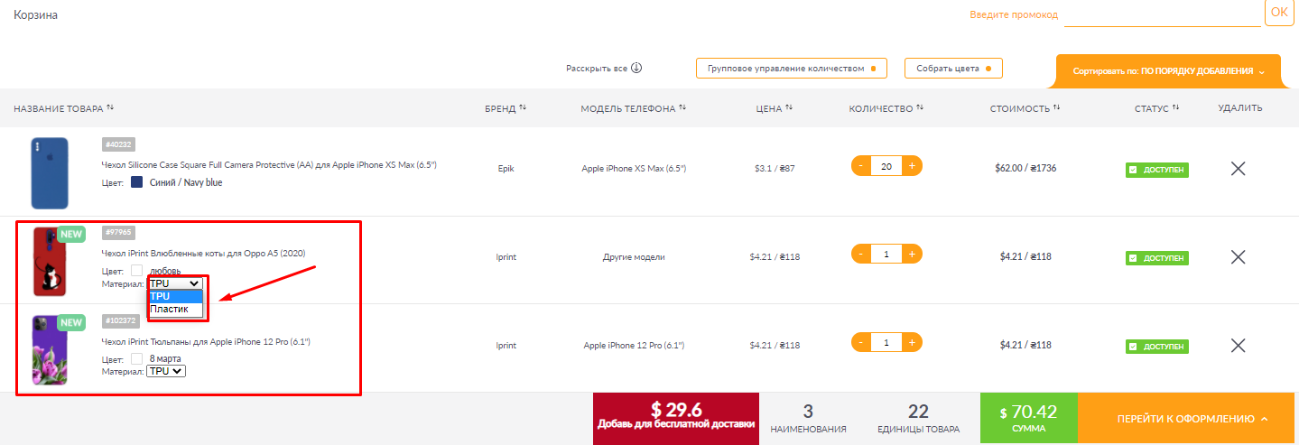 Функционал в Корзине - Изменение цвета и материала.