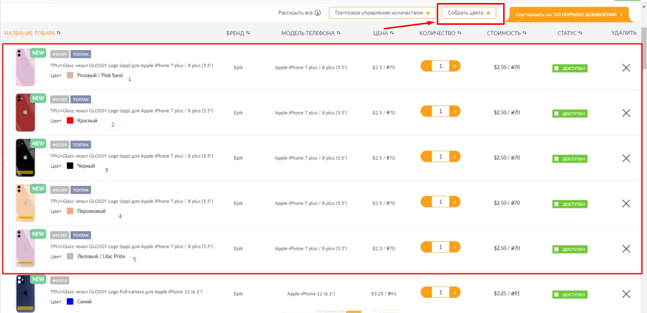 Эта функция сворачивает в одну строчку позицию, на которую заказаны несколько цветов, тем самым облегчая работу в Корзине. Для этого необходимо всего лишь нажать "собрать цвета" чтобы список товаро...
