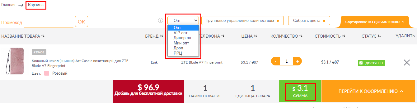 Конечно мы не оставили без внимания Корзину и теперь вы можете так же выводить нужный тип цен в заказе. Есть несколько Типов цен, которые можно выбрать.Они выгружаются согласно Вашего Договора: ОПТ...