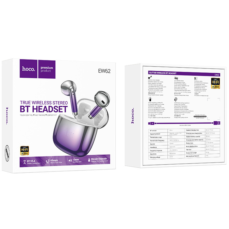 Наушники Hoco EW62 Glitter оснащены передовой версией Bluetooth 5.3, что обеспечивает стабильное соединение на расстоянии до 10 метров. Каждый наушник имеет аккумулятор ёмкостью 30 мА·ч, а кейс — 300 мА·ч, что позволяет наслаждаться музыкой до 4 часов без подзарядки. Время разговора составляет до 3,5 часов, а полная зарядка занимает около 2 часов через разъём Type-C. Сенсорное управление делает использование наушников интуитивно понятным и удобным.