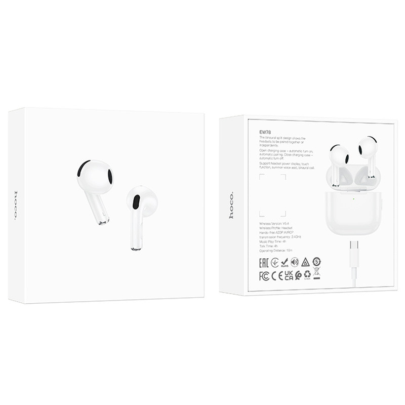 Наушники Hoco EW78 выполнены в форм-факторе вкладышей и поддерживают подключение через Bluetooth 5.4, что обеспечивает стабильное соединение и высокое качество передачи звука. Время работы без подзарядки составляет до 4 часов, а емкость аккумулятора наушников — 30 мАч, что позволяет наслаждаться музыкой или разговорами без частой подзарядки. Кейс для зарядки имеет емкость 300 мАч, что обеспечивает дополнительное время работы.