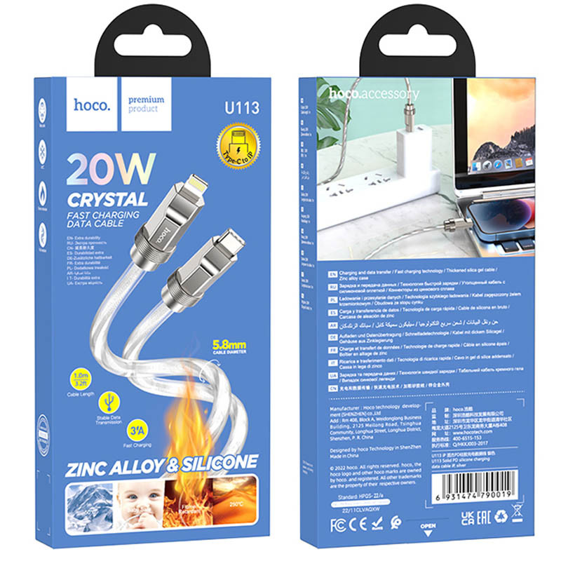 Кабель Hoco U113 изготовлен из высококачественных материалов, что обеспечивает его долговечность и надежность. Внешний слой выполнен из прозрачного силикона с цветным алюминиевым плетением, что придаёт кабелю стильный вид и защищает его от повреждений. Соединительные элементы изготовлены из цинкового сплава, что гарантирует прочность и устойчивость к износу.