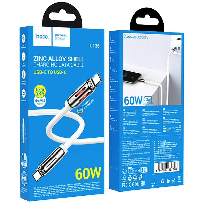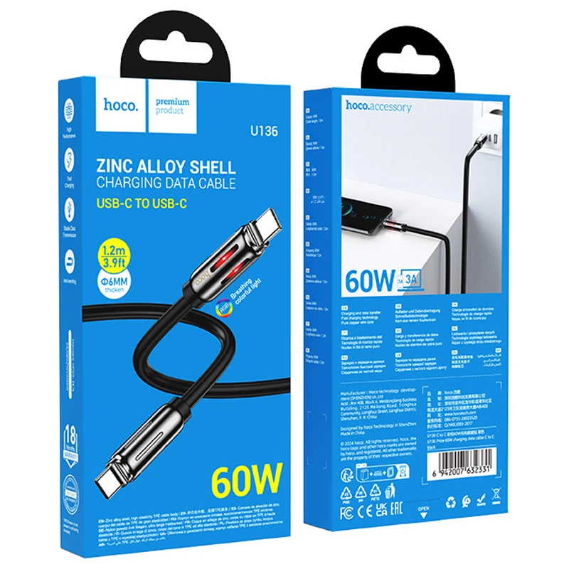 Кабель Hoco U136 изготовлен из высококачественных материалов, что гарантирует его долговечность и надежность. Внешний материал TPE обеспечивает гибкость и устойчивость к износу, а коннекторы из цинкового сплава повышают прочность соединений. Сердечник кабеля, состоящий из (55/0.08)*2+(16/0.08)*3 OD6mm, обеспечивает стабильную передачу данных и зарядку.