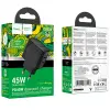 Зарядное устройство Hoco CS62A Bright PD45W изготовлено из высококачественных материалов ABS+PC, что обеспечивает его долговечность и устойчивость к механическим повреждениям. Оно оснащено двумя портами USB-C, которые поддерживают мощность до 45W, что позволяет заряжать устройства с различными стандартами быстрой зарядки, такими как PD, QC, FCP и AFC. Это делает его универсальным решением для зарядки смартфонов, планшетов и других гаджетов.