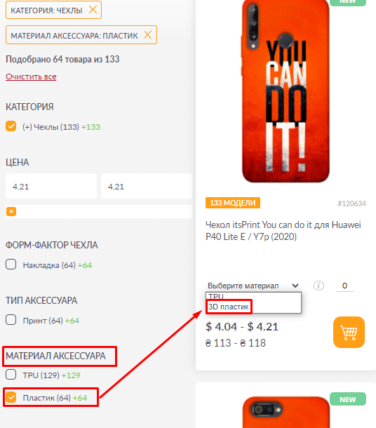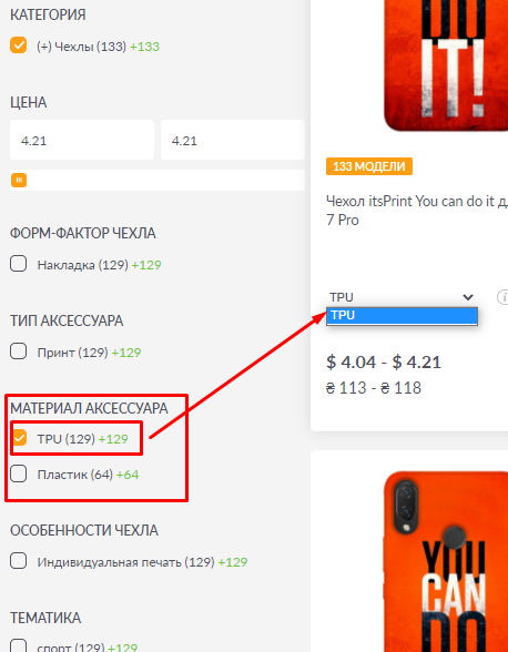 Тепер можна сформувати посилання на сайті, на які моделі itsPrint Є ПЛАСТИК, а на які ТПУ прямо на панелі фільтрів.