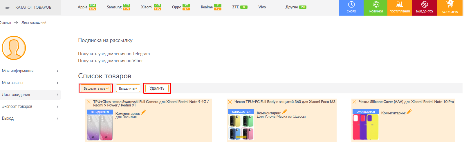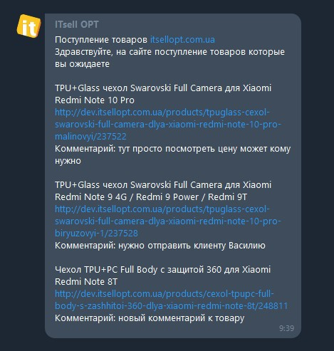 смс-ки з приходом товару, який доданий в Лист Очікування.